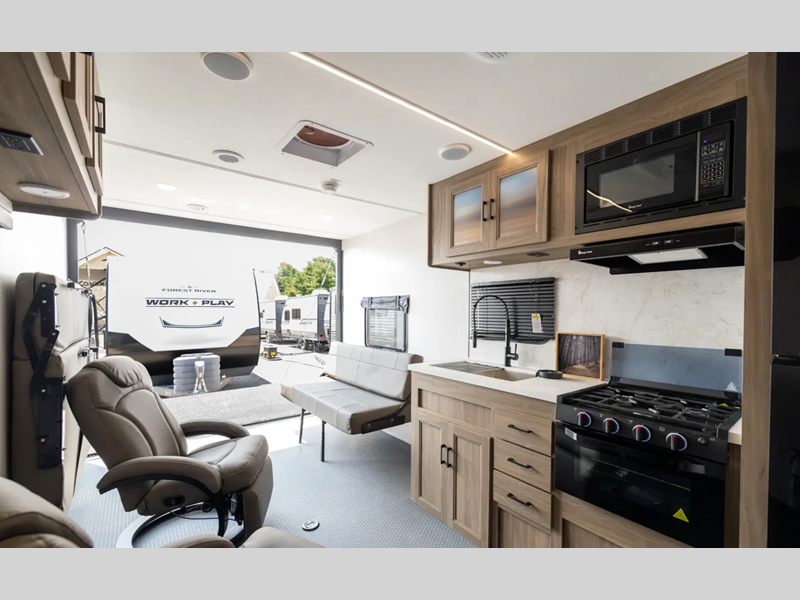 Sleeps 4 Length 32 ft 11 in Ext Width 8 ft 6 in Ext Height 11 ft 3 in Hitch Weight 1072 lbs GVWR 10500 lbs Dry Weight 6790 lbs Cargo Capacity 3710 lbs Fresh Water Capacity 98 gals Grey Water Capacity 35 gals Black Water Capacity 35 gals Tire Size 15" Furnace BTU 30000 btu Available Beds King Refrigerator Type 12V Refrigerator Size 10 cu ft Cooktop Burners 3 Shower Size 32" Number of Awnings 1 Garage Size 15 ft 9 in LP Tank Capacity 30 lbs Water Heater Type Tankless AC BTU 15000 btu TV Info LR Smart TV Awning Info 20' Velarium Velocity Power Awning Switch w/LED Light Strip Axle Count 2 Number of LP Tanks 2 Shower Type Radius Electrical Service 30 amp Similar Floorplans