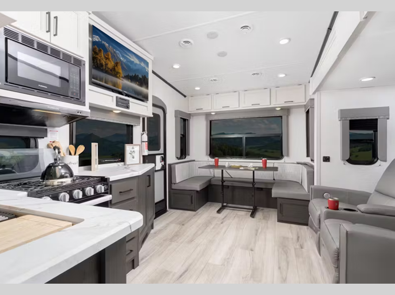 Sleeps 5 Slides 1 Length 28 ft 10 in Ext Height 12 ft 6 in Hitch Weight 1345 lbs Dry Weight 7545 lbs Cargo Capacity 1955 lbs Fresh Water Capacity 54 gals Grey Water Capacity 60 gals Black Water Capacity 30 gals Tire Size ST225/75R15E Available Beds Queen Refrigerator Type 12V Solar Friendly Refrigerator Size 10.4 cu ft Cooktop Burners 3 Number of Awnings 1 LP Tank Capacity 30 lbs Water Heater Type Girard On Demand Tankless AC BTU 15000 btu TV Info LR TV Awning Info 17' Electric with Gas Strut Arm Axle Count 2 Number of LP Tanks 2 Shower Type Standard Electrical Service 50 amp Similar Floorplans