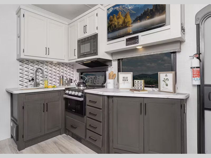 - 17" Furrion® range w/ Piezo ignition and glass stovetop cover