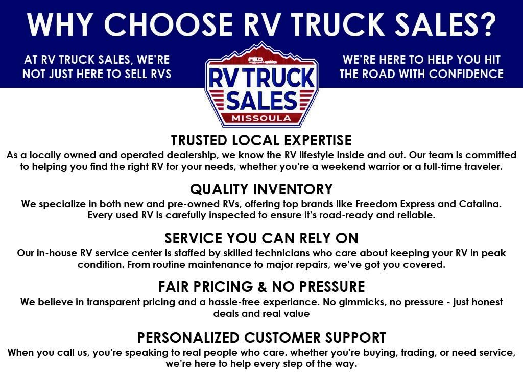 RV Truck Sales Missoula is not responsible for any misprints, typos, or errors found in our website pages. Any price listed excludes sales tax, registration tags, and delivery fees. Manufacturer pictures, specifications, and features may be used in place of actual units on our lot. Please contact us @406-543-1479 for availability as our inventory changes rapidly. All calculated payments are an estimate only and do not constitute a commitment that financing or a specific interest rate or term is available.